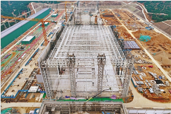 开展越州换流站高端阀厅屋面网架整体提升工作。 通讯员 朱肖和 摄