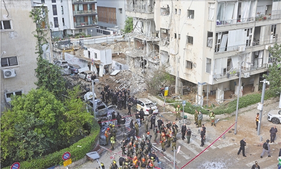 3月24日,在以色列中部城市特拉维夫,应急人员在导弹袭击现场处置。据以色列媒体报道,特拉维夫多个地点24日早间被伊朗导弹击中,造成多人受伤。