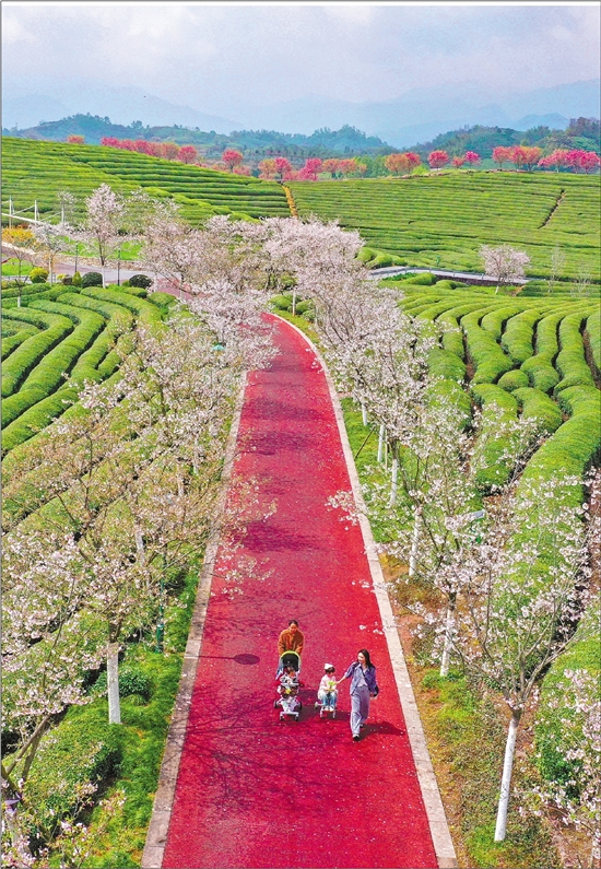 3月25日,在武义县花田美地景区,樱花盛放、茶园吐绿,吸引游客前来踏青游玩。 本报记者 潘秋亚 通讯员 时宽兵 摄