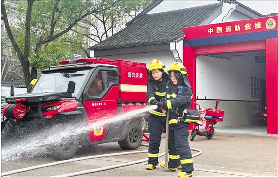 记者(右)练习操纵水枪。 通讯员 龚洁节 摄