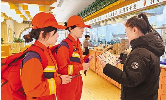 排查消防安全隐患后,记者(左一)和消防队员一起向店家普及消防知识。 通讯员 龚洁节 摄