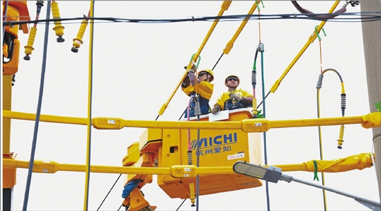 上虞区供电公司工作人员正在进行带电作业 图片由上虞区供电公司提供