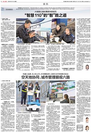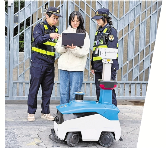 记者张熙锦(中)用电脑查看机器人巡查路线。 通讯员 狄可心 摄