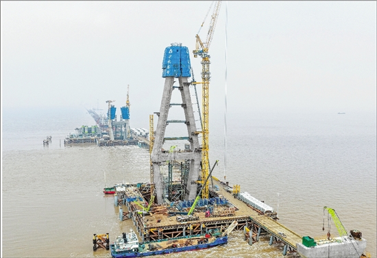 近日,通苏嘉甬杭州湾跨海铁路桥施工现场一派繁忙。 通讯员 姚峰 张滔 王昊 摄