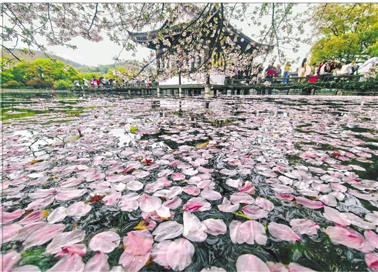3月30日,受弱冷空气影响,杭城忽雨忽晴。西湖景区,被风雨打落的樱花漂浮在水面,亦成了一道唯美的风景。 通讯员 里尔 摄