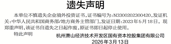 本单位不慎遗失企业境外投资证书,证书编号为:N3300202300420,发证机关:中华人民共和国商务部/地方商务主管部门,发证日期:2023年5月18日。现郑重声明,该证书自遗失之日起作废,原证书即日起停止使用。