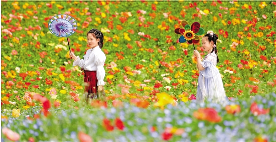 4月4日,小朋友在江苏省句容市白兔镇伏热花海玩耍。 新华社发(钟学满 摄)