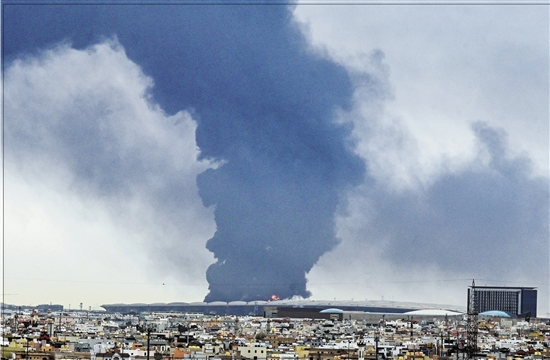 这张3月25日在科威特首都科威特城拍摄的照片显示,位于费尔瓦尼耶省的科威特国际机场一油库遭袭后冒起浓烟。 新华社发