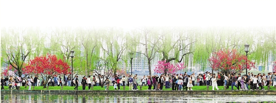 4月4日,杭州西湖,众多市民、游客或漫步白堤,或泛舟湖上,享受春日美景。 通讯员 里尔 摄
