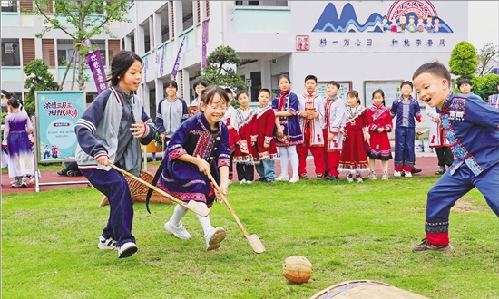 4月17日,金华开发区汤溪小学东祝校区举行“三月三”民俗文化活动。学生身穿畲族等民族服饰,通过体验跳竹竿、摇铁锅、打篾球等特色民俗活动,沉浸式感受民俗文化魅力。图为学生在体验打篾球民俗活动。 本报记者 潘秋亚