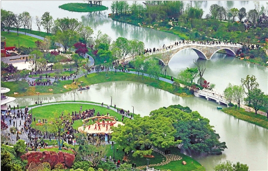 温州园博园内,游客穿梭于山水之间,沉浸式体验这场国家级园林盛会带来的生态福利与休闲乐趣。