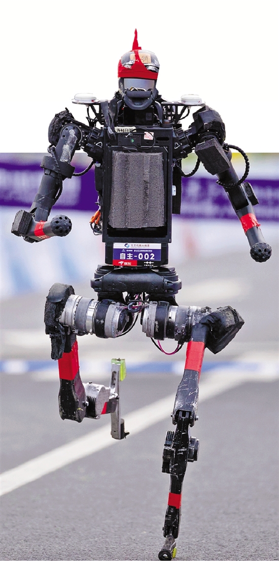 来自“杭Y赛队”自主人形机器人宇树“H1”在比赛中。本报记者 倪雁强 刘晨茵 侴雪妍 摄