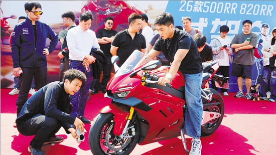 4月19日,张雪机车杭州临平店举行机车试驾活动,吸引众多机车爱好者齐聚,体验冠军车型820RR。