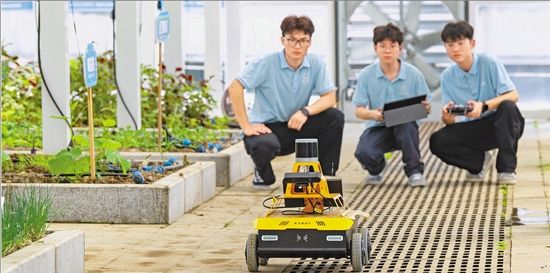 4月20日,浙江省金华职业技术大学信息工程学院智慧农业应用基地里,由校企联合开发的AI农业巡检机器人在巡检中。这台机器人采用四轮独立驱动设计,配合高精度编码器,同时搭载深度相机与激光雷达,实时搭建三维地图、自主规划路径,可智能识别作物长势与病虫害情况。 通讯员 胡肖飞 摄 |