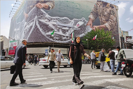 4月20日,伊朗德黑兰,民众在街头走过一块展示美国飞机被困在霍尔木兹海峡网中的广告牌。 CFP供图