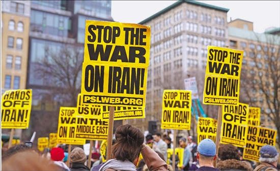 2026年3月7日,人们在美国纽约参加集会游行,抗议美国和以色列对伊朗发动军事打击。