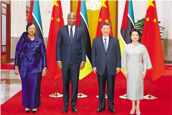 4月21日下午,国家主席习近平在北京人民大会堂同来华进行国事访问的莫桑比克总统查波举行会谈。这是会谈前,习近平和夫人彭丽媛同查波和夫人盖塔合影。 新华社记者 黄敬文 摄