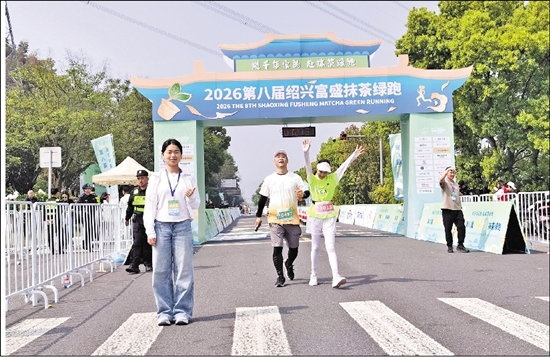 富盛抹茶,是产业,也是风景。4月19日上午,徐州医科大学学生陈凌俐(左前一)作为志愿者,积极服务2026第八届绍兴富盛抹茶绿跑。