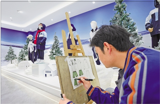 在童装企业的设计室内,设计师正在绘制新款童装草图。