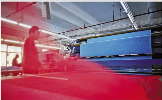浙江经典童话服饰有限公司,工人操作自动化设备裁切服装布料。