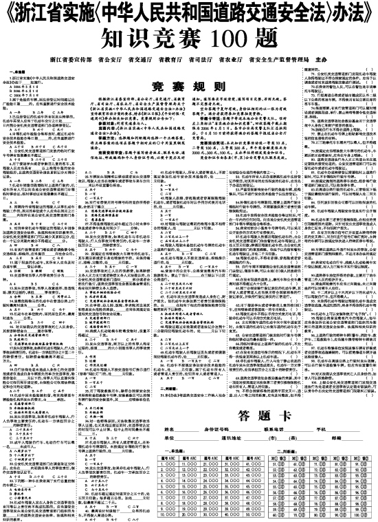 根据浙江省委宣传部、省公安厅、省交通厅、省教育厅、省司法厅、省农业厅、省安全生产监督管理局关于《浙江省实施<中华人民共和国道路交通安全法>办法》宣传教育活动方案的要求,特在《浙江日报》、《平安时报·交通周刊》举办相关知识竞赛。竞赛规则公告如下: