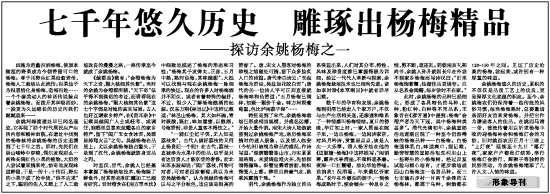 《越郡志》载有:“会稽杨梅为天下之奇,颗大核细其色紫”。当时的余姚为会稽郡所辖,“天下奇”似乎得不到确切的考证,而看看现在的余姚杨梅,“颗大核细其色紫”这七个字倒是对她的真实写照。古人也好互赠家乡特产,在《贵耳杂》中记载吴越闽广人士或赶考、或调任,到哪里总喜欢炫耀各自的家乡特产,留下“闽广玉女含冰雪,吴郡星郎驾火云”之句。吴越杨梅在品质上,尤以余姚杨梅独占鳌头,于是到了汉代,余姚杨梅就跻身贡品之列。