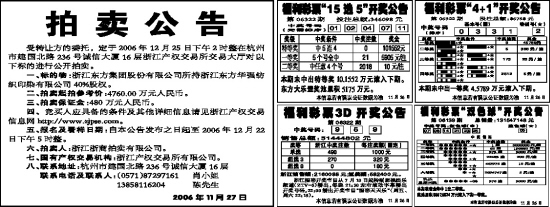 受转让方的委托,定于2006年12月25日下午2时整在杭州市建国北路236号诚信大厦16层浙江产权交易所交易大厅对以下标的进行公开拍卖。