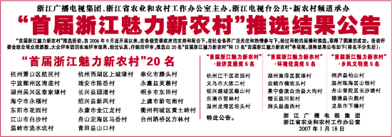 “首届浙江魅力新农村”推选活动,自2006年9月底开展以来,在各级党委政府的支持和配合下,在社会各界广泛关注和热情参与下,经过两轮的展播和推选,取得了圆满的成功。活动评委会结合观众投票数、大众评审团的实地评审结果,经过认真、仔细的评审,推选出20名“首届浙江魅力新农村”和15名“首届浙江魅力新农村”单项奖,现将结果公布如下(排名不分先后):
