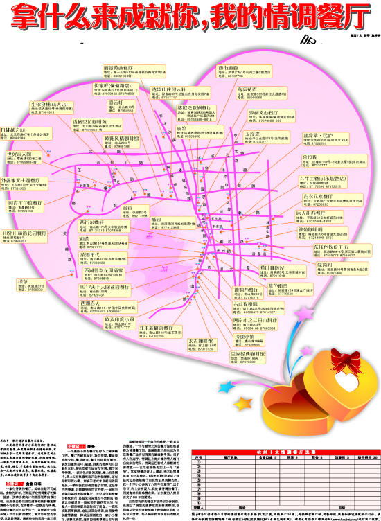 注:请各位读者将心目中的情调餐厅填在表格中(可少填,不能多于10家),并按照食物口味、就餐环境、服务和浪漫指数给予打分。表格请寄杭州市体育场路178号浙江日报《生活周刊》收(表格复制有效)。读者也可登录口碑网论坛(www.koubei.com)进行网上投票。