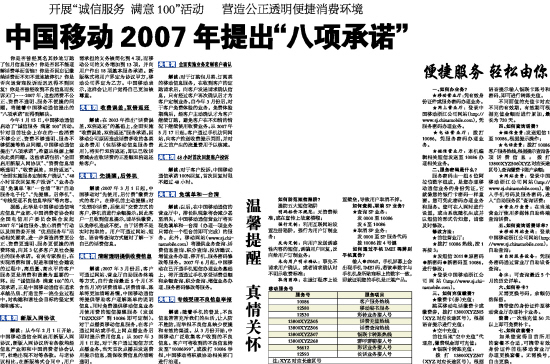 今年1月15日,中国移动通信启动了“诚信服务 满意100”活动。针对目前社会上存在的一些消费不够公正、资费不够透明、服务不够便捷等热点问题,中国移动通信提出“八项承诺”,希望从根源上解决此类问题。这些承诺包括:“全面启用新版入网协议”、“资费信息清晰透明”、“收费误差,双倍返还”、“全面实施服务定制客户确认”、“48小时首次回复客户投诉”、“业务办理‘免填单’和‘一台清’”和“自助服务电子化”、“先提醒,后停机”、“专线受理不良信息举报”等内容。