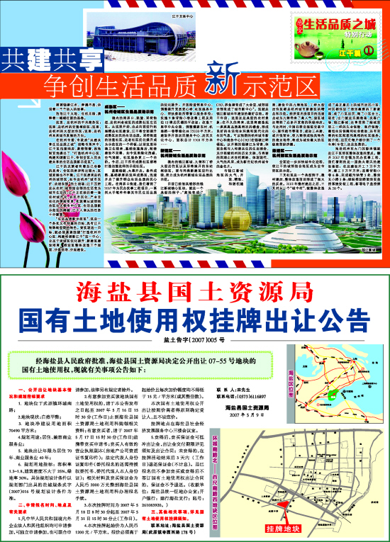 经海盐县人民政府批准,海盐县国土资源局决定公开出让07-55号地块的国有土地使用权,现就有关事项公告如下: