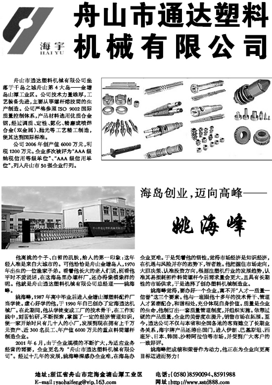 他高挑的个子、白皙的肌肤,给人的第一印象:这年轻人准是来自大城市的。可他恰恰是舟山金塘岛人,1970年出生的一位渔家子弟。看着他长大的老人们说,别看他平时不爱说话,在这海岛里办螺杆厂,还办得像模像样的呢。他就是舟山通达塑料机械有限公司总经理——姚海峰。