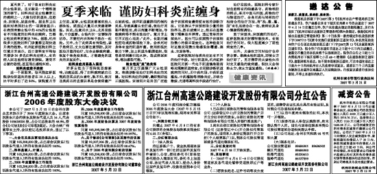 本公司于2007年5月15日在台州市群众艺术馆召开了2006年度股东大会。出席本次股东大会的股东及股东代理人共34人,代表股份105628220股,占公司总股本的48.9%,符合《公司法》及《公司章程》规定。大会由林广祥董事长主持,会议经记名投票表决,通过了以下事项: