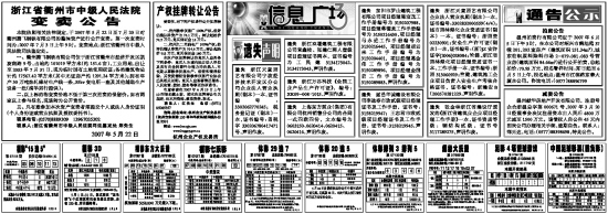 本院依照相关法律规定,于2007年5月22日至7月20日对衢州腾飞钢铁有限公司的整体资产进行公开变卖。第一次变卖时间为:2007年7月3日上午9时。变卖地点:浙江省衢州市中级人民法院司法鉴定处。