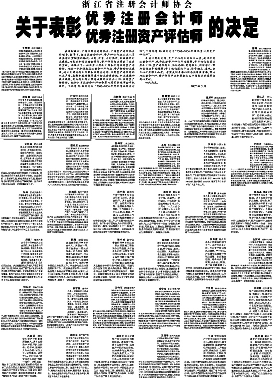 在省财政厅、中国注册会计师协会、中国资产评估协会的领导、指导下,全省注册会计师、资产评估行业从业人员认真学习贯彻党的路线、方针、政策,与时俱进,积极推进行业建设,为构建和谐注册会计师、资产评估行业作出了突出的贡献,涌现出了一批优秀注册会计师和优秀注册资产评估师。为进一步加强我省注册会计师行业、资产评估行业建设,树立良好的行业形象和注册会计师、注册资产评估师的职业声誉,表彰和鼓励模范遵守行业法律法规、职业道德和执业规范,并为行业作出显著成绩的注册会计师、注册资产评估师,经浙江省注册会计师协会第四届常务理事会审议决定,王冶等28名同志为“2005~2006年度优秀注册会计师”,王传军等10名同志为“2005~2006年度优秀注册资产评估师”。