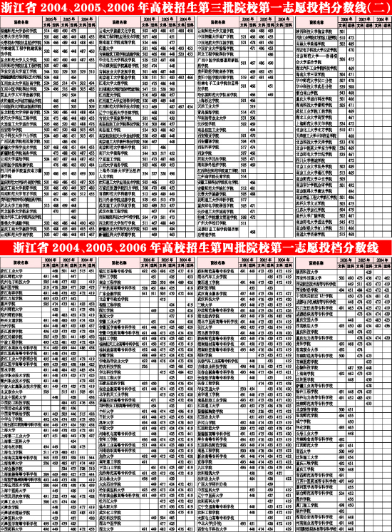 浙江省2004、2005、2006年高校招生第三批院校第一志愿投档分数线(二)