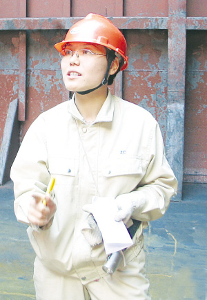 她就是宁波港航管理局船舶检验科的高级现场船检师应扬苹。1995年,应扬苹从一名船厂技术员调入船检科时,个性好强的她先发制人,主动找领导,要求到检验第一线去。然而当她终于如愿以偿第一次踏上船体检验岗位时,却有点始料不及。酷热的夏天,室外温度几乎达到40摄氏度。一脚踏上甲板,热气能从鞋底透入脚底。更让她感到难堪的是,粗犷的船工几乎清一色的光膀子、短裤衩。但应扬苹咬咬牙坚持了下来。而这一坚持就是12年。