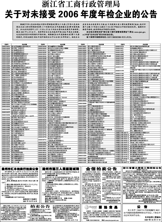 根据《中华人民共和国公司登记管理条例》第五十九条、《中华人民共和国企业法人登记管理条例》第二十四条和《企业年度检验办法》第四条的规定,企业应当在每年3月1日至6月30日向企业登记机关提交年检材料。截至2007年6月30日,尚有部分企业未向我局申报2006年度企业检验,也未在我局责令的限期内申报补检。现根据《企业年度检验办法》第十九条的规定,对尚未接受2006年度年检的企业予以公告(名单附后)。相关企业应当自本公告发布之日起60日内到浙江省工商行政管理局(地址:杭州市莫干山路77号金汇大厦北门915室)申报企业年检并接受处罚。逾期仍不接受年检的,我局将依法吊销营业执照。
