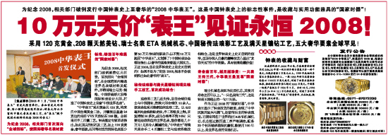【焦点事件】2008年1月,“2008中华表王”首发式隆重举行。参加首发式的陈静、陈小敏等奥运冠军指出:钟表大师以丰富的中国元素及尖端工艺,为“表王”赋予深刻而独特的纪念2008的含义!