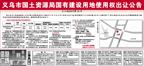 四、详细资料和具体要求:本次拍卖出让的详细资料和具体要求见拍卖文件。申请人可于2008年5月5日至2008年5月12日,到义乌市365便民服务中心二楼土地交易市场获取拍卖资料。