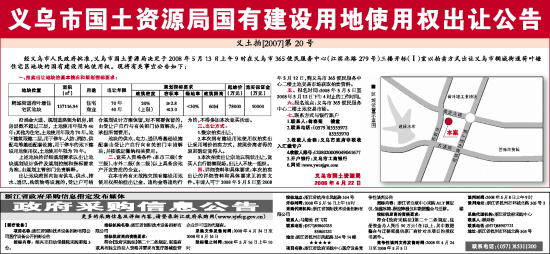 四、详细资料和具体要求:本次拍卖出让的详细资料和具体要求见拍卖文件。申请人可于2008年5月5日至2008年5月12日,到义乌市365便民服务中心二楼土地交易市场获取拍卖资料。