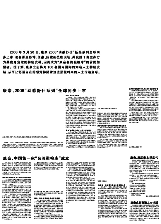 2008年3月20日,康奈2008“动感舒仕系列”全球同步上市新品发布会在温州华侨饭店盛大开幕。发布会现场云集了数十家主流媒体,当红影星陈坤、任泉、陈紫函和近百名海内外嘉宾应邀出席盛会,共同感受靓丽登场的康奈新款——“动感舒仕系列”带来的卓越体验。这是康奈集团2007年“经典舒仕”之后,再次为广大消费者带来的“舒适”旋风。