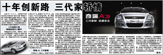 即将上市的奇瑞A3,被普遍看做是奇瑞的第三代家轿车型,产品定位与精三样相同。奇瑞公司董事长尹同耀曾不无自豪地坦言:“A3是奇瑞向改革开放三十周年的献礼之作,它凝聚了奇瑞人十多年以来的梦想,造属于国人自己的车,创第三代家轿精品。”品鉴会上,奇瑞汽车股份有限公司总经理助理金弋波正式宣布,奇瑞A3定位中国第三代家轿,并推出“全新欧轿,动感安全”的品牌口号。A3汲取了三代家轿所长,以欧洲最新的流行风格和工艺为标杆进行设计和制造,车身设计已通过五星碰撞标准、ESP、多连杆后独立悬架、宽体欧版造型,A3已在同级车型中树立起了多项家轿新标准。