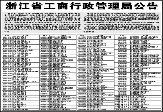 各有关当事人:下列企业(下称当事人)均系2006年12月31日前经浙江省工商行政管理局(下称我局)核准登记设立的企业,应当依法参加2006年度企业年检。但当事人未在法定期限2007年6月30日前向我局提交年检材料接受年检。我局依法责令当事人在2007年7月31日前接受年检,当事人亦未在责令的期限内参加年检。我局于2007年10月17日在《浙江日报》上发布未按规定参加年检企业催检公告,要求当事人自公告之日起60日内接受年检,截止公告期满当事人仍未接受年检。我局于2008年4月1日向当事人邮寄发出行政处罚听证告知书,并于2008年6月10日在《浙江日报》上以公告的方式告知当事人拟作出的行政处罚及其听证的权利,当事人均未提出听证要求。当事人不按规定接受年检的行为,已分别违反了《中华人民共和国公司登记管理条例》第五十九条、第六十条第一款、《中华人民共和国企业法人登记管理条例》第二十四条和《企业年度检验办法》第四条第一款的规定。根据《中华人民共和国公司登记管理条例》第七十六条、《中华人民共和国企业法人登记管理条例》第三十条第一款第(三)项和《企业年度检验办法》第十九条第二款的规定,我局于2008年7月11日作出吊销当事人营业执照的处罚决定(处罚决定书文号:浙工商案(2008)22号)。