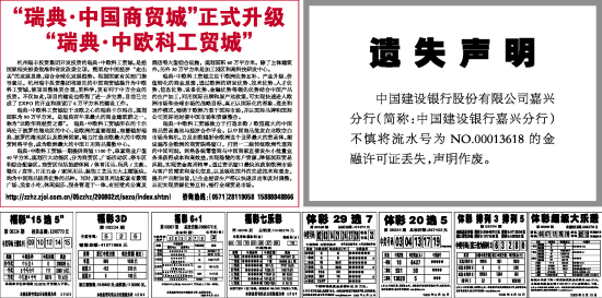 中国建设银行股份有限公司嘉兴分行(简称:中国建设银行嘉兴分行)不慎将流水号为NO.00013618的金融许可证丢失,声明作废。