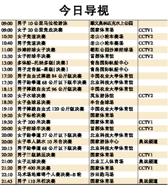 21:00 女子足球决赛 北京工人体育场 奥运频道