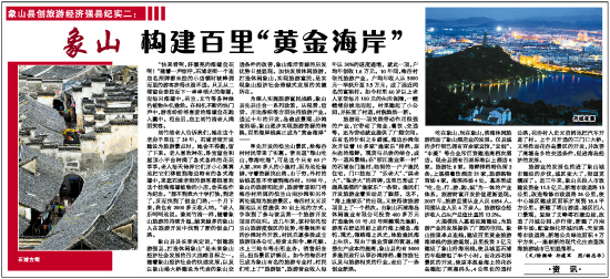 为深入实施旅游富民战略,象山县先后出台一系列政策,从税费、信贷、用地指标等方面扶持旅游产业。通过十年的开发,岛礁成景观、沙滩变浴场,象山逐步实现旅游资源的转换,百里海岸线真正成为“黄金海岸”——