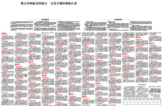 2.“经典江南小镇”将在经过两轮投票竞选后产生。第一轮:在初选乡镇中,结合参评乡镇的自愿报名与读者投票的情况,经专家研究讨论(短信和评委,权重5∶5),推选出20个提名名单。第二轮:将参考评委会意见和读者投票数量(短信和评委,权重5∶5),从提名名单中选出最终的10个“经典江南小镇”。
