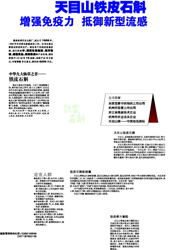 天目山牌铁皮石斛软胶囊,是以优质铁皮石斛为原料,配以西洋参、枸杞子等天然药材精制而成。本品采用科学提取工艺,加工成极易于人体吸收的软胶囊剂型。经国家权威部门的药理实验和各项功能性实验证实,具有显著的机体免疫力调节和延缓人体器脏衰老的作用。尤其对因“虚症”(阴虚、气虚、血虚)而导致的各种人体免疫功能调节失衡所引发的各种症疾,对各种“虚疾”、“劳虚”引起的早衰现象,更具明显的补益功能。