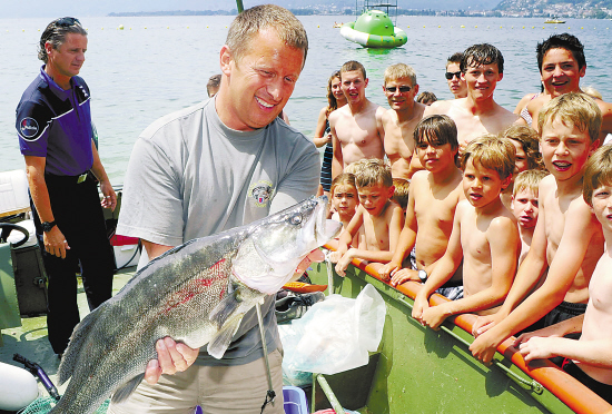 7月12日,在瑞士南部的马焦雷湖,一名男子展示警方人员捕获的一条鲈鱼。这条长70厘米、重8公斤的鲈鱼在上周末咬伤了6名戏水者,其中两人在医院接受了紧急救护,其伤口长达10厘米。 新华社发